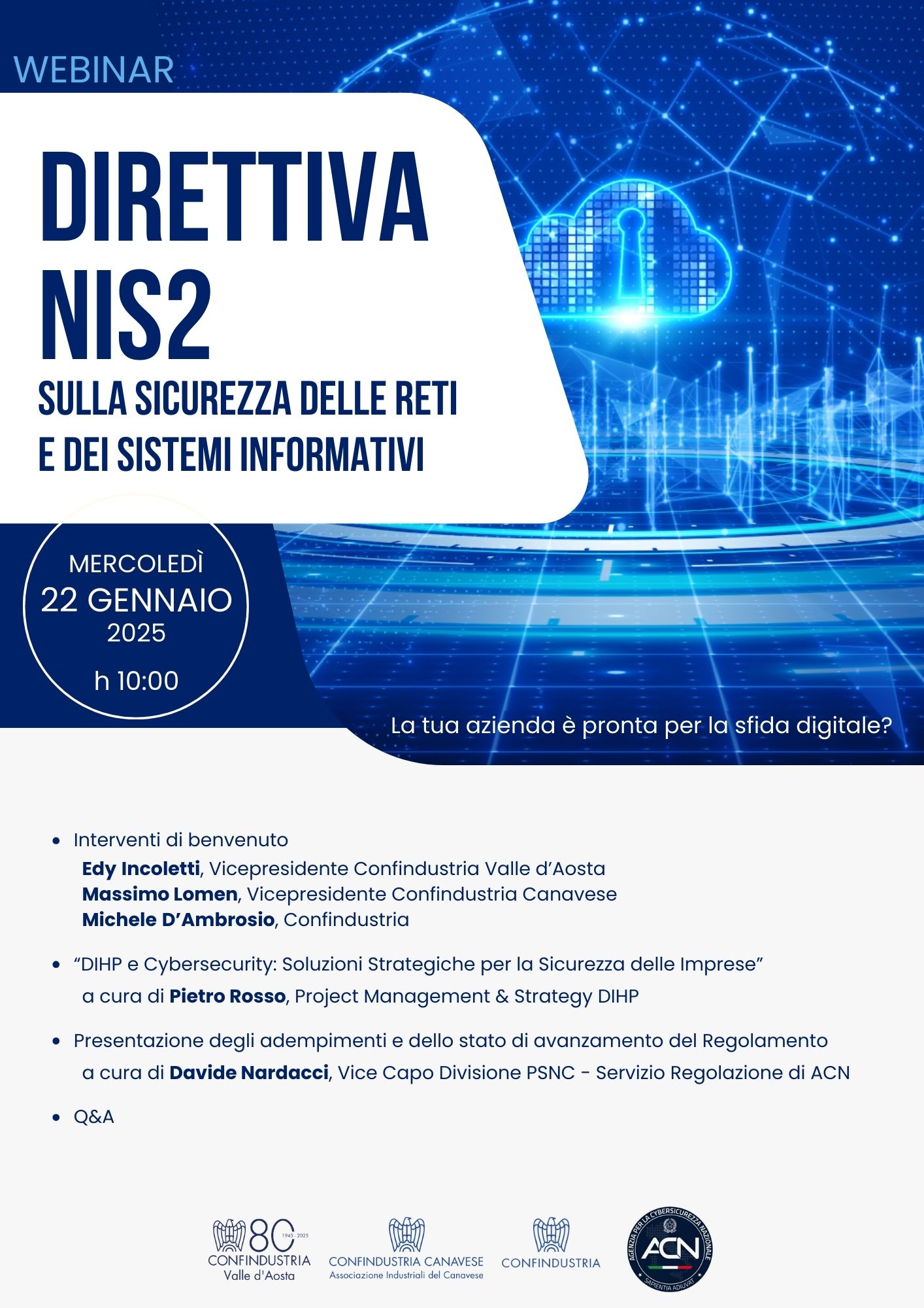 Non perdere il Webinar sulla Direttiva NIS2 organizzato da Confindustria Valle d’Aosta e Confindustria Canavese, un’occasione unica per scoprire tutto quello che c’è da sapere sulla sicurezza delle reti e dei sistemi informativi.